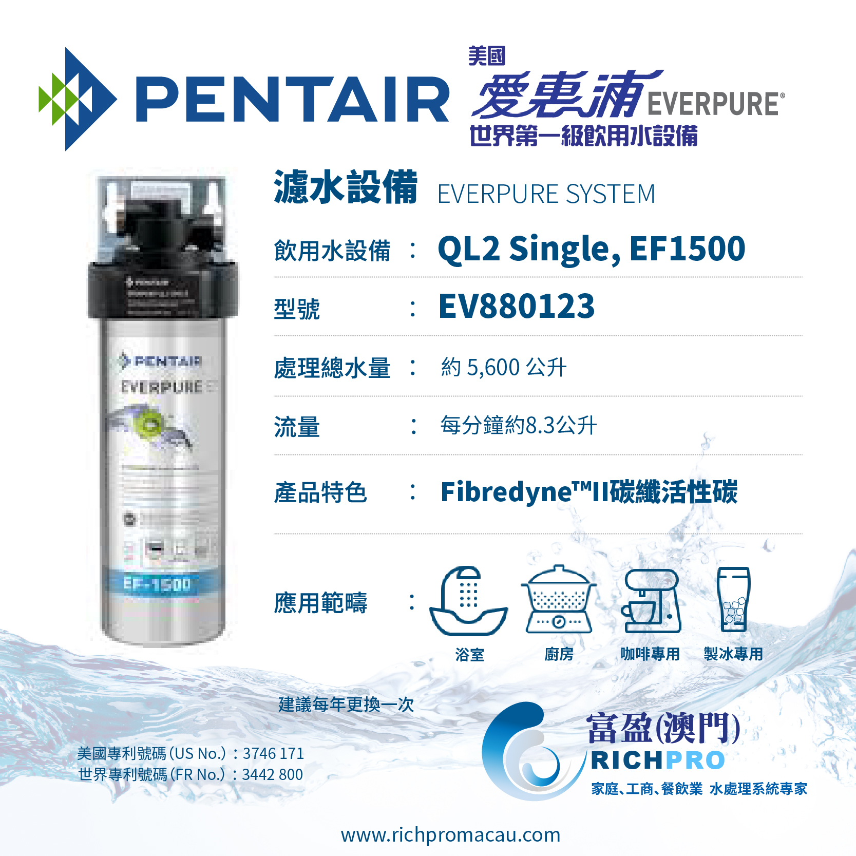 通過富盈(澳門)RICHPRO 購入的Everpure 原廠濾頭,濾芯,是以全機設備認證的方式通過NSF認證,符合材料安全、結構完整及有效濾除效能,確保顧客所飲用的水是純淨且安全無虞。
